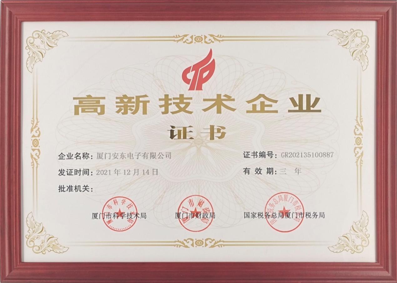 廈門安東電子連續(xù)16年榮獲廈門市高新技術(shù)企業(yè)稱號(hào)