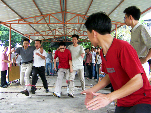 在動(dòng)工燒烤之前有2項(xiàng)激情熱身賽----拔河比賽、雙人接力賽,員工根據(jù)事先安排分為A、B、C、D四組。比賽緊張而激烈地進(jìn)行著,竟?fàn)幍膱雒娌粊営趭W運(yùn)會(huì)。裁判嚴(yán)肅公正,隊(duì)員也奮力拼搏。尚未比賽的兩組充當(dāng)啦啦隊(duì),加油!加油!加油!多么激動(dòng)人心的吶喊。不多時(shí)已有一組決出了勝負(fù),她們高興地歡呼著。經(jīng)過最后的角逐,勝利者產(chǎn)生了,你看他們笑的多開心,勝利的喜悅都寫在了臉上。接下來的雙人接力賽同事們也樂在其中,配合默契,互相協(xié)助共同邁著大步向前沖,激發(fā)出團(tuán)隊(duì)的合作精神以及更高昂的工作熱誠和拼搏創(chuàng)新的動(dòng)力,使團(tuán)隊(duì)更富凝聚力。