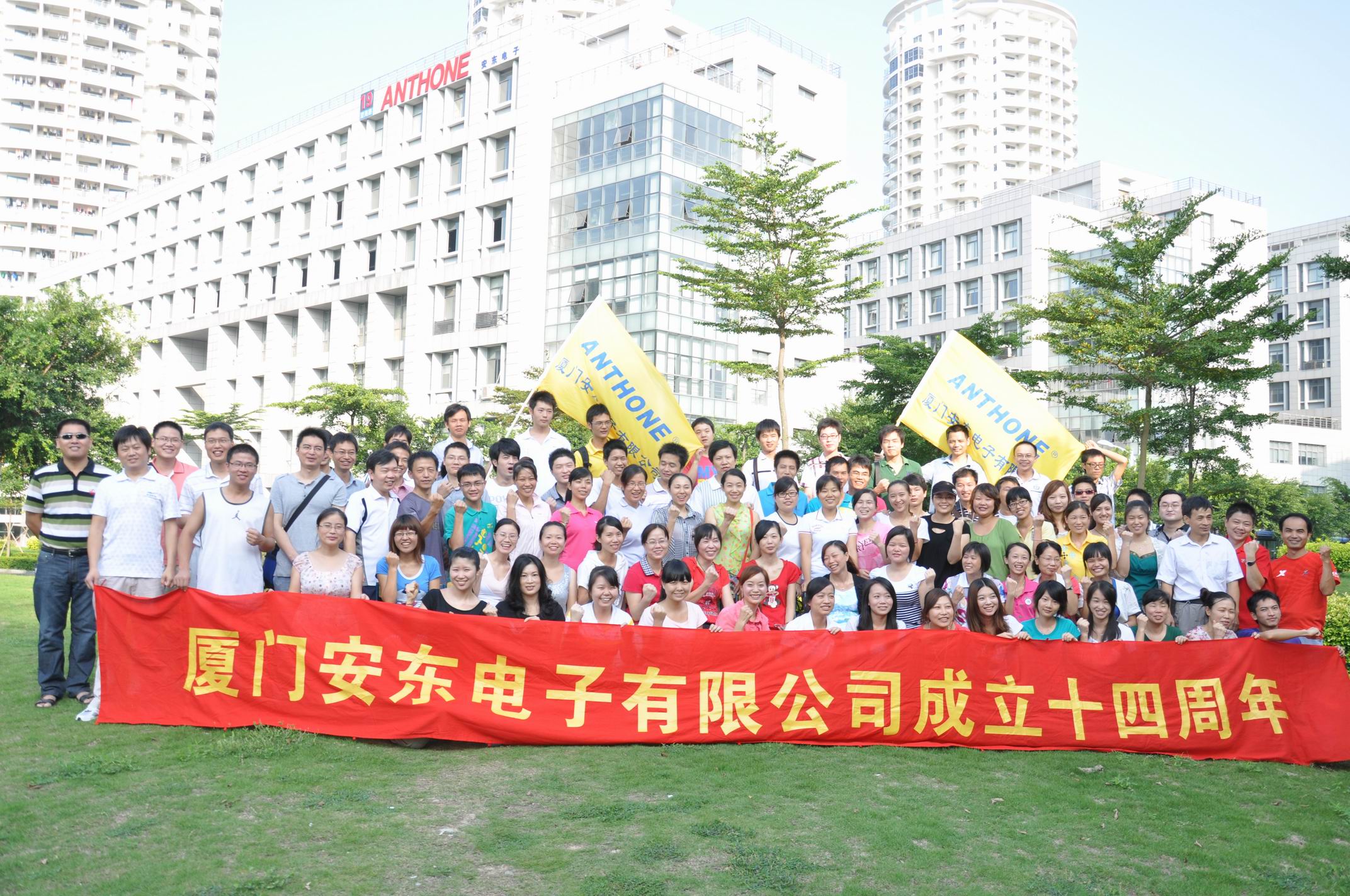 在出發(fā)之前,為了紀念今天特殊的日子,也是安東公司成立14周年的大慶,全體員工要來一個集體照。攝影大師選了片碧綠色的草地,背景為安東那宏偉的建筑物,以45°的視角拍照,期間過程不再嘮叨。