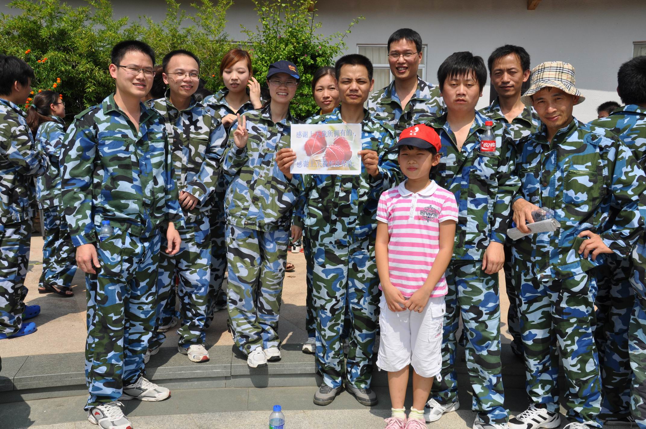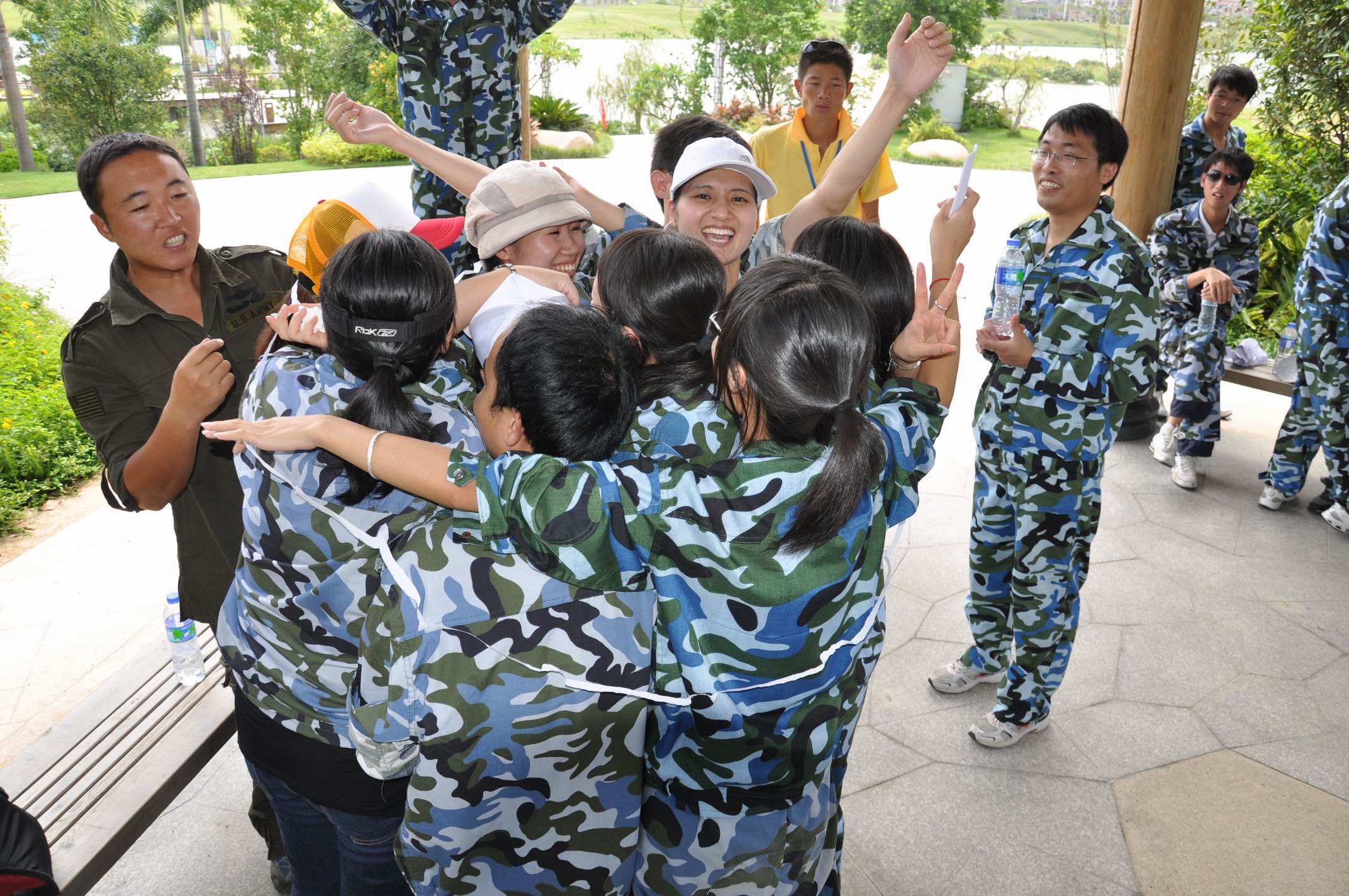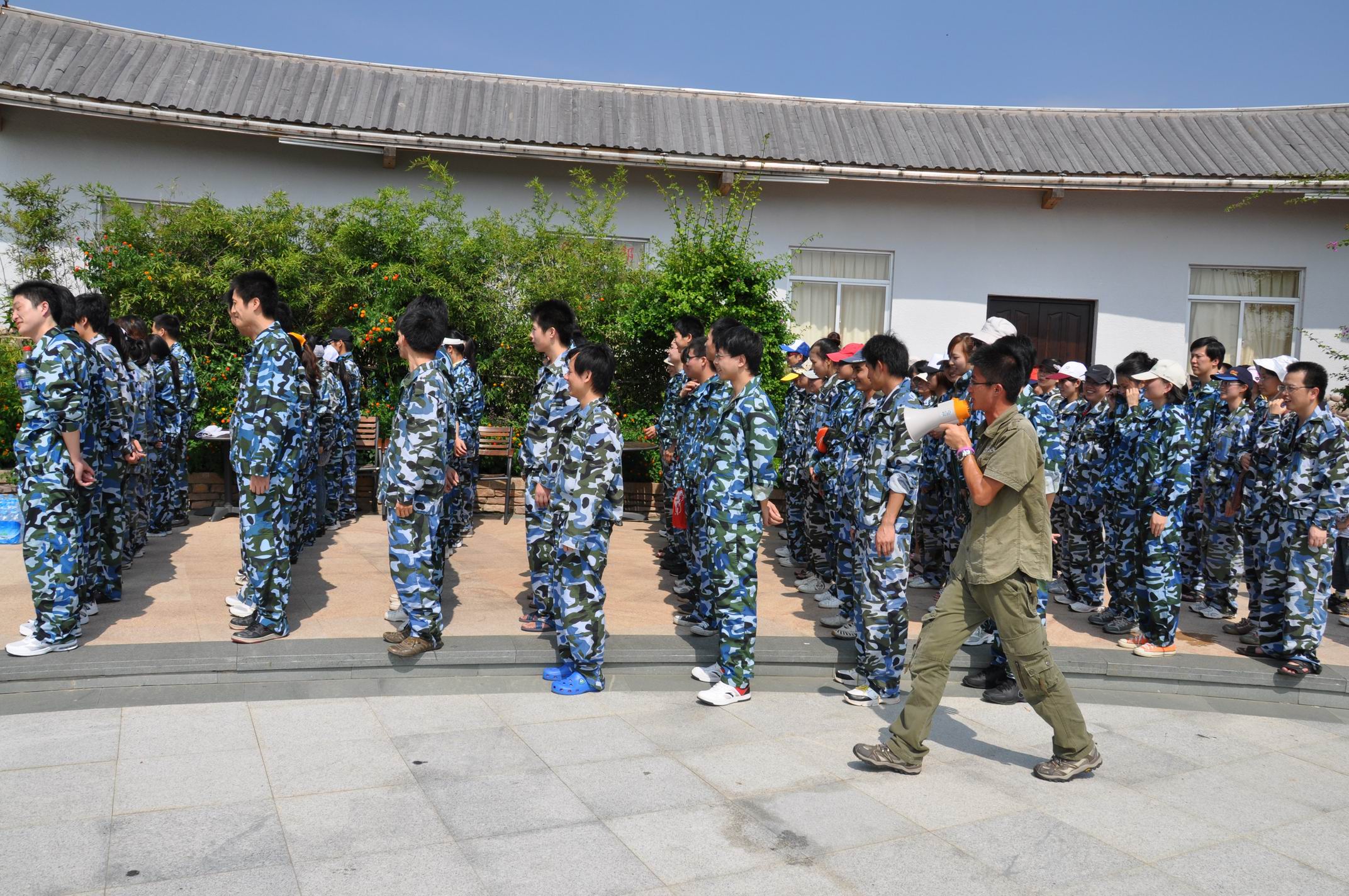 大巴停靠在惠安的聚龍小鎮(zhèn)的馬路旁。我們有秩序地下車。此時的9點28分。驕陽如火,炙烤著大地,干燥火熱的氣流,直逼人汗流浹背。大伙兒們猶如出巢的蜜蜂,各個直奔陰涼竹林處“避暑”。在竹林靜候大概五分鐘,后勤部隊做好善后工作叫大伙兒換迷彩服。集體換好后一起原地候命即將到來的教官。