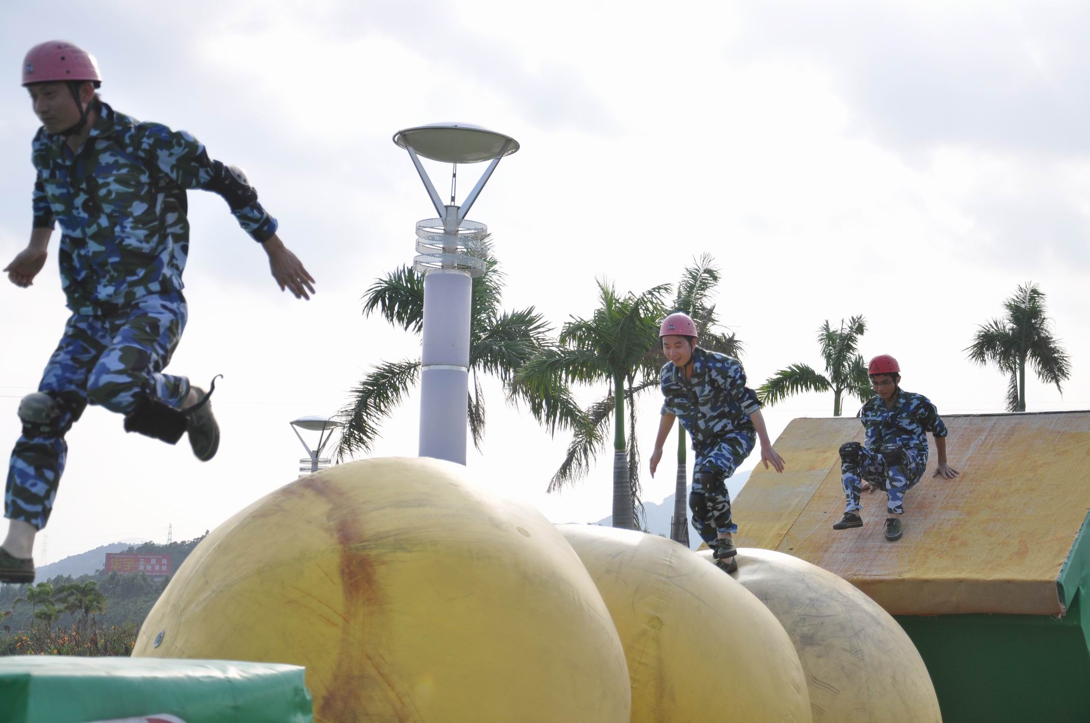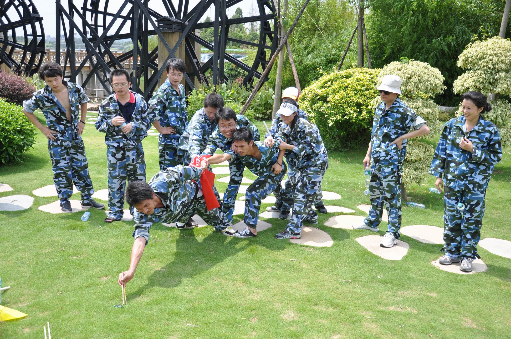 我們第四小組是第四組出場。這就有機會多看看前面幾組的闖關經驗,汲取下經驗。第一組在最后第三關卡時候全軍覆沒,全體“濕身”。悲催啊!引起很多人的嘆息和反思。炮灰就是悲劇啊!炮灰的人你們傷不起!接著,第二組出戰(zhàn)!由于該組女子占99.99%,所以出戰(zhàn)陣型就全裝——全部女子。誰說女子不如男,四個女子表現(xiàn)很鎮(zhèn)定,也很勇敢,最終在一陣精彩喝彩中完美完成挑戰(zhàn),無人“濕身”,起了個好兆頭。第三組,正常隊形,一人在第一關卡落難“濕身”,一人在轉盤落難“濕身”,其余通過!最后一組輪到我們了。不得不說,看前幾組闖關的時候,我心臟也沒這么鼓蕩,撲通撲通地亂跳。深呼吸,深呼吸,走!去“濕身”吧。我們組三男二女開始了挑戰(zhàn)巨龍島。不幸的是我們三個男子中小蘇叫我第一個上。好吧,早跳早“濕身”。第一關卡:必須蛙跳到彈性球上,而且是連續(xù)兩個,中間一個彈性板。慢慢來,我強壓心慌,在一片驚呼聲中險險地安全著陸,再一聲疾呼聲中安全著陸,很幸運,我們三男子全部通過第一關卡。然后是和二女接應合作過獨木橋,爬轉盤,扔彈球,越絲網,跳小艇,滑扶梯,上山巖,各中險象環(huán)生,一波三折,跌宕起伏,驚呼聲一浪接著一浪,最終也是完美地全部通過無人“罹難”,位居本批比賽的準榜首!通過這項勇闖巨龍島比賽關卡,我們這組壯士們個個灰頭土臉的,但是很欣慰。在闖關過程中的那種配合默契,彼此互扶最終迎接勝利的體驗還是很棒的!
