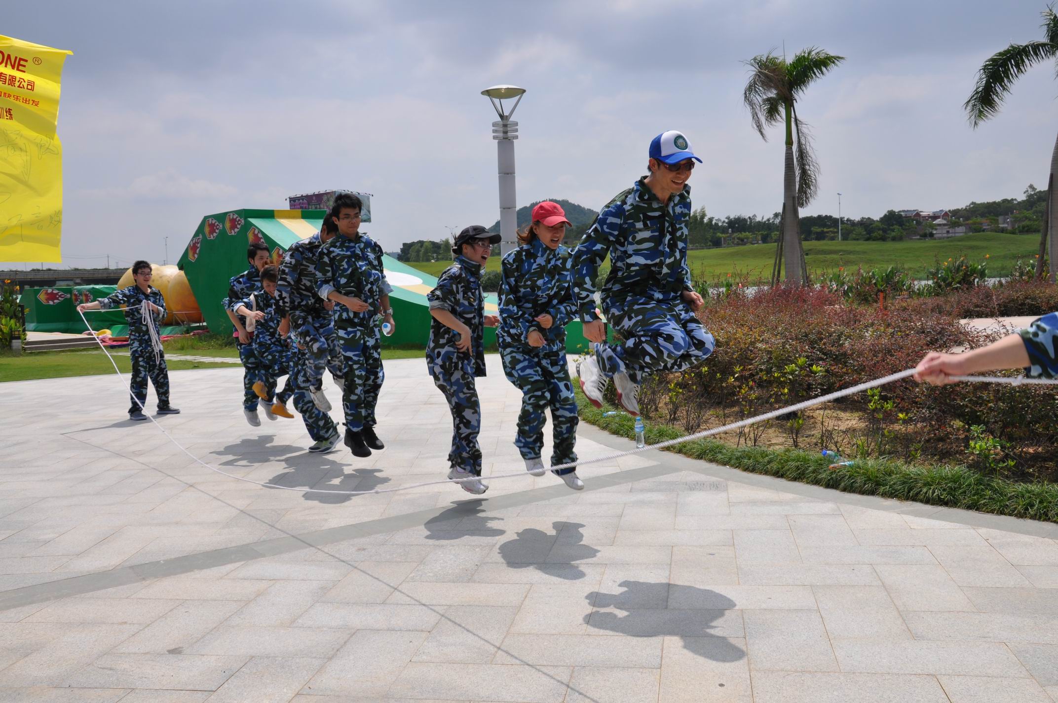 上午的主要是陸地類活動,一共五項。每項場地各不一樣,每處場地各有一名執(zhí)行官在待命。五項中,有考核體力類,考核智力類,考核團隊合作類。對于我們第四組來講,跳繩這一項目,耗時最長。既考核體力又考核團隊合作。要求兩個人搖繩,其余全部在里面跳,跳十下則視為挑戰(zhàn)成功。在挑戰(zhàn)該項目中,我們遇到各種各樣的困難,中間有想過要放棄,但是內心還是不服輸,一次又一次的嘗試,一次又一次的失敗,一次又一次的不言敗,大家相互鼓勵,雖然消磨著體力全無,很多次的再來、再來……最后,終于完美完成了挑戰(zhàn)。大家都歡欣鼓舞,那一刻,感覺到整個團隊的凝聚力是無比的龐大,大家也開始默認了這個隊伍,承認隊員。通過這一項,我們從中明白,永不言敗是通往成功的一大因素,團隊的互相鼓舞也是一種重要的前進動力。