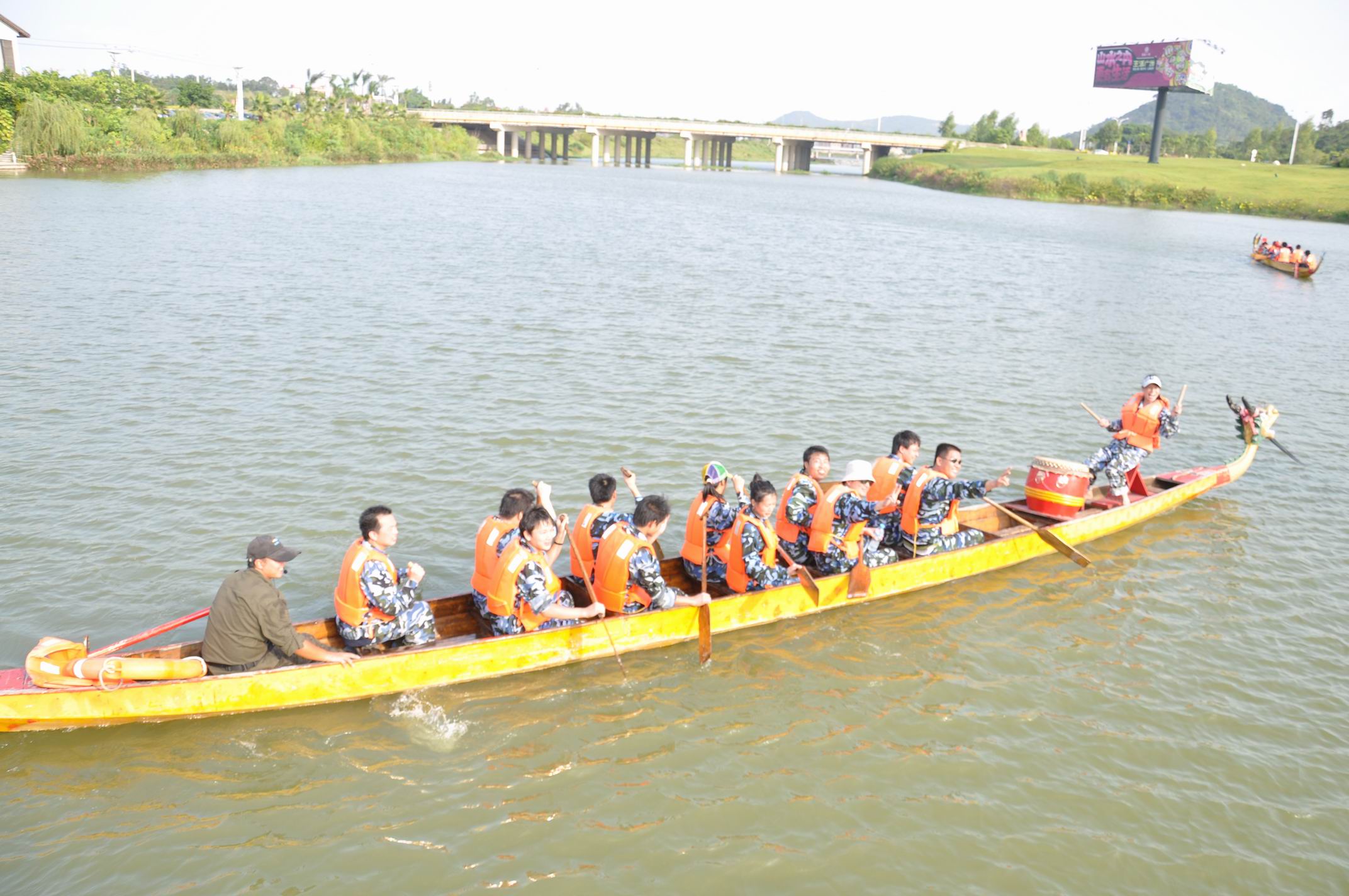 龍舟賽,分兩組,每組四個小分隊。因為我是第四小分隊的。所以,有幸第一批去挑戰(zhàn)龍舟賽。在龍舟賽場地,一名指導員四名掌舵者在。關于龍舟賽的一些規(guī)則,注意安全事宜指導員都一一細心地分析。