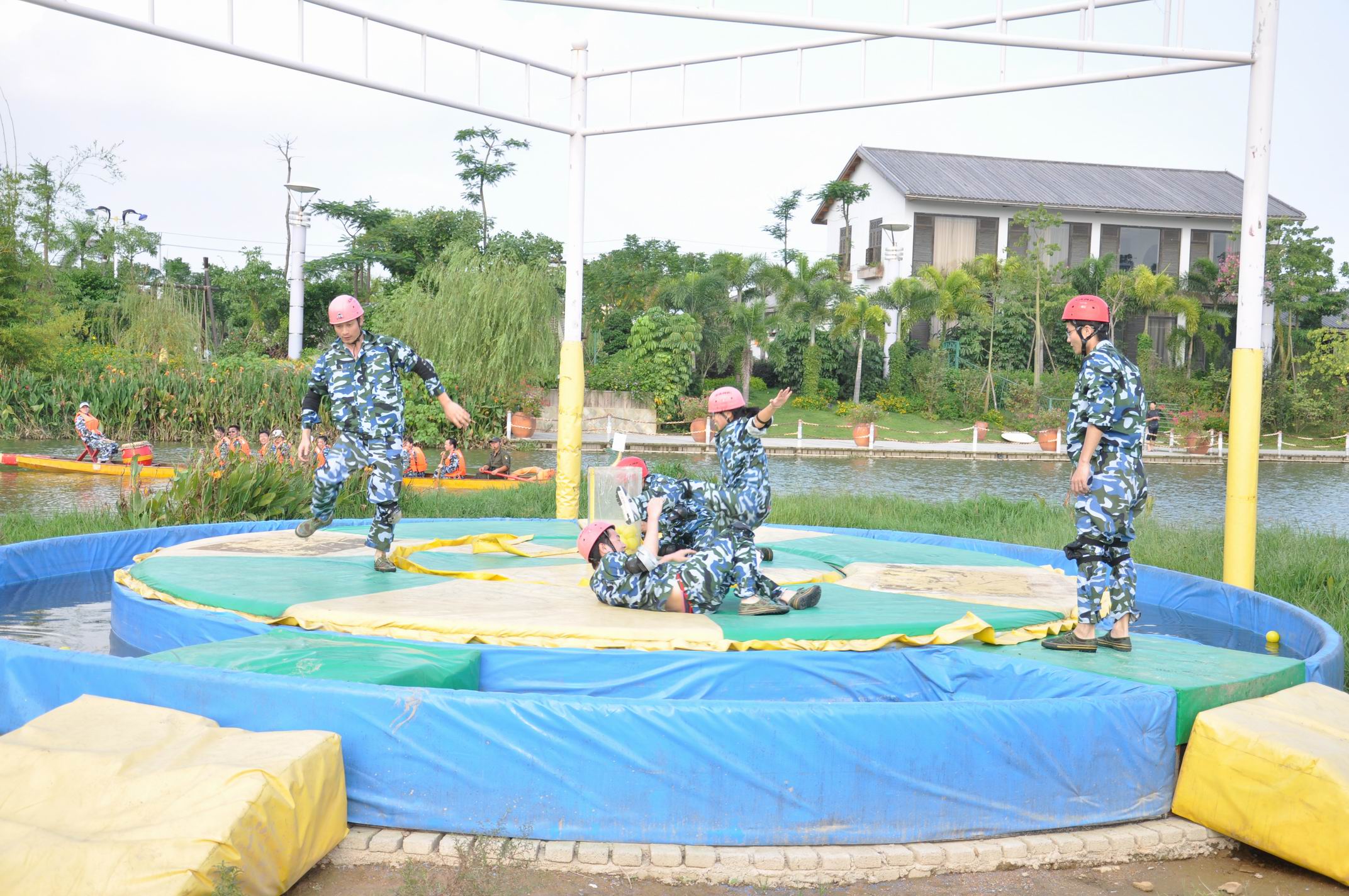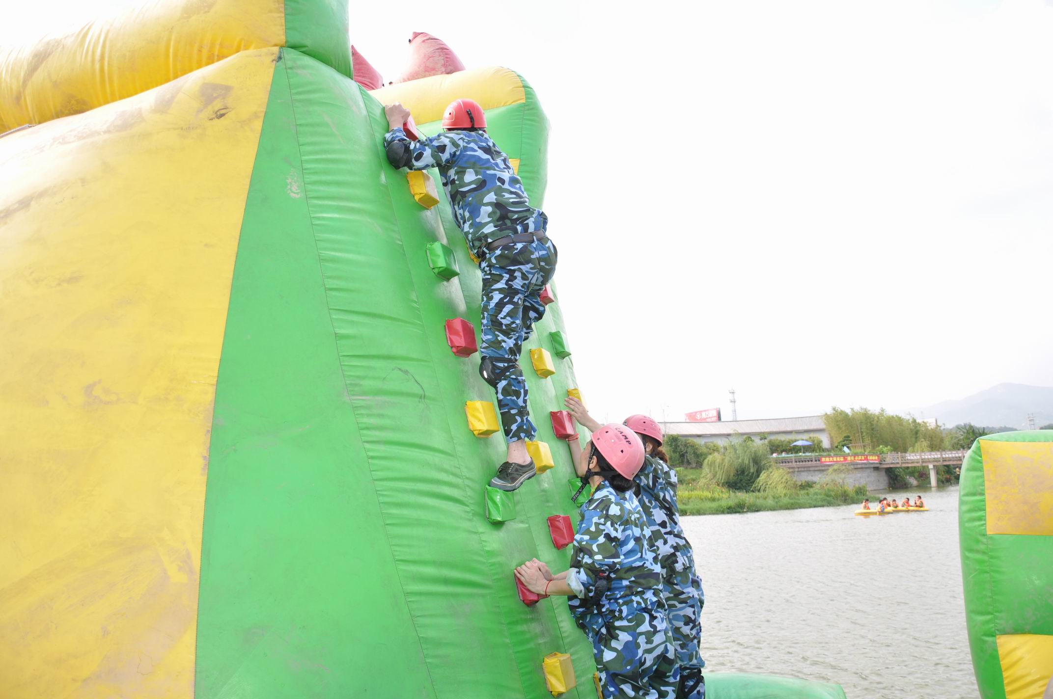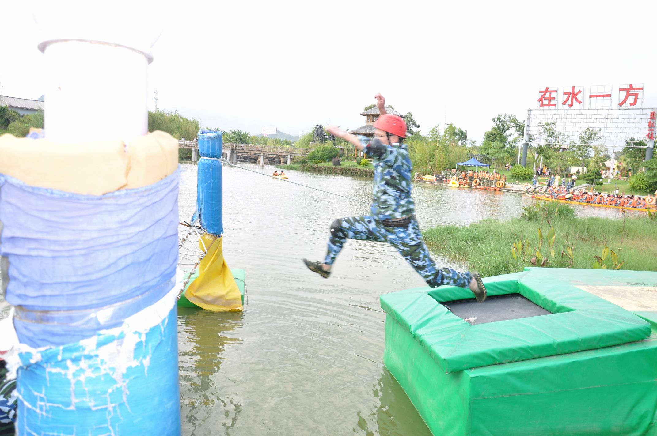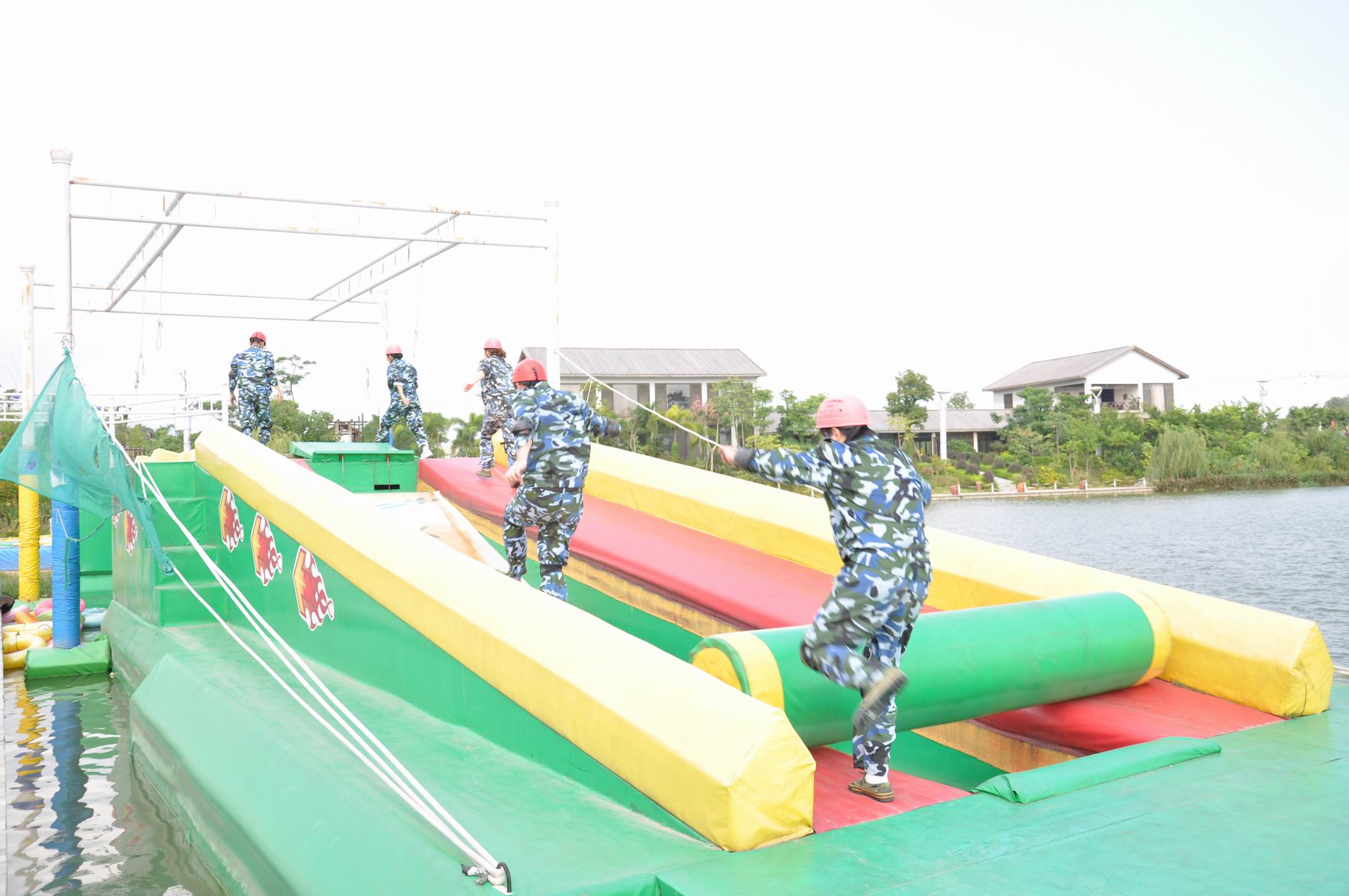 下午4點25,開始了名副其實驚心動魄的勇闖巨龍島。出戰(zhàn)要求:每小分隊派出三男二女。通過協(xié)調互助,最終完成所有關卡到達終點。此時的太陽,不在那么的強烈,反而開始變著溫和。一片金黃色的光暈籠罩著整個聚龍小鎮(zhèn),把聚龍小鎮(zhèn)染成暖暖的金黃色。巨龍島的指導員,也一一講解各個關卡注意的事宜以及安全問題。從第一關卡一一帶領大家身臨其境地詳解,講完最后關卡的時候,看著我們這些出戰(zhàn)的人員各個膽顫心驚,魂不守舍。這也忒坑爹貨啊!獨自暗嘆自己即將面臨的地獄式挑戰(zhàn)同時,面部卻露出一副勇士一去不復還的雄心壯士。