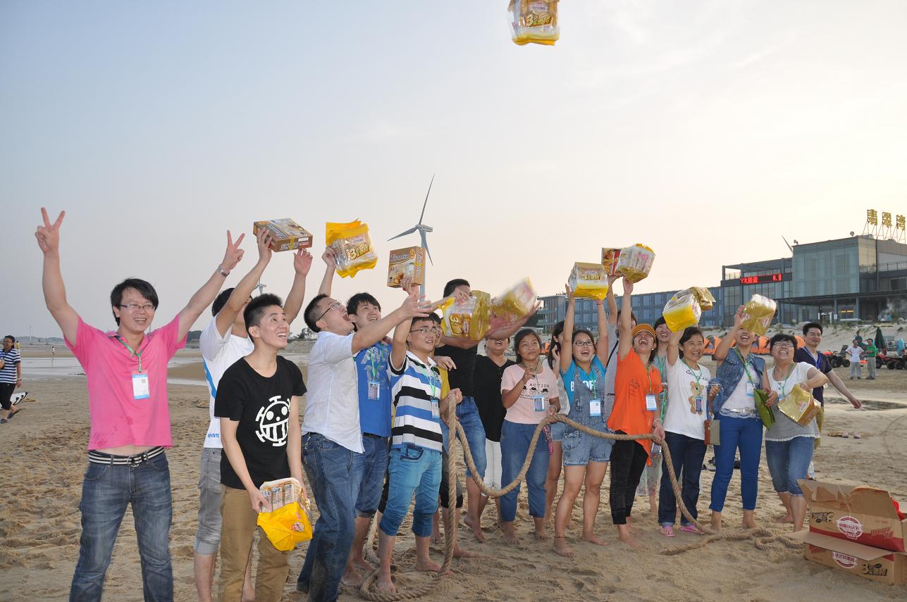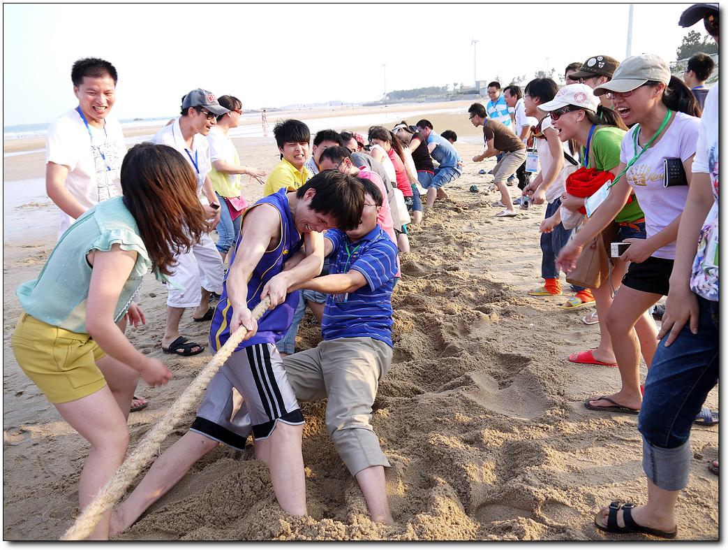 在30分鐘中之后,同事都把自己的帳篷搭好了。正是夕陽西下,海水一會兒波濤洶涌,一會又風平浪靜,復雜多變不但沒有影響同事們的游興,反而讓大家見識了與平時不般的海灘夜景,同事們有的一時迎風去浪,一時展臂潛游,不亦樂乎。幾分鐘過后,大家也都收拾好心情準備接下來的拔河比賽了。終于輪到我們組上場了,我們的對手是第三組。王經(jīng)理把參加比賽的隊員按照從高到矮的順序排好,隨著裁判的一聲令下,比賽開始了。只見隊員們雙手一前一后,緊緊地攥住繩子,雙腳分開,用力蹬著地,身體向后傾斜著,一邊有節(jié)奏地高喊“一、二!一、二!”,一邊共同用力拉繩子。我們組的拉拉隊員一邊大喊著“加油!加油!”,一邊用手勢指揮著隊員們用力。只見繩子一會兒被我們拉過來,一會兒又被對方拉過去,僵持下去。就在這關鍵時刻,我們趁著對方放松的一瞬間,一把奪過繩子,我們贏了,進決賽。在決賽我們面臨的強大的二組隊員,在前面我們都耗用了太多的體力,所以在決賽我們就一局輸贏。決賽開始了,隊員們心往一處想,勁往一處使,其他同事也不停地吶喊助威:加油!加油!隊員們憋足了勁,拼命地用力拉繩子。終于,在大家堅持不懈的努力下,我們贏了。比賽結(jié)束了,我們組拿到了第一名,我們集體合照,讓大家留下一個美好的回憶。同事們都覺得這次活動很有趣。大家紛紛表態(tài):今后要好好鍛煉身體,下次再有這樣的活動,我們一定要爭取得冠軍!