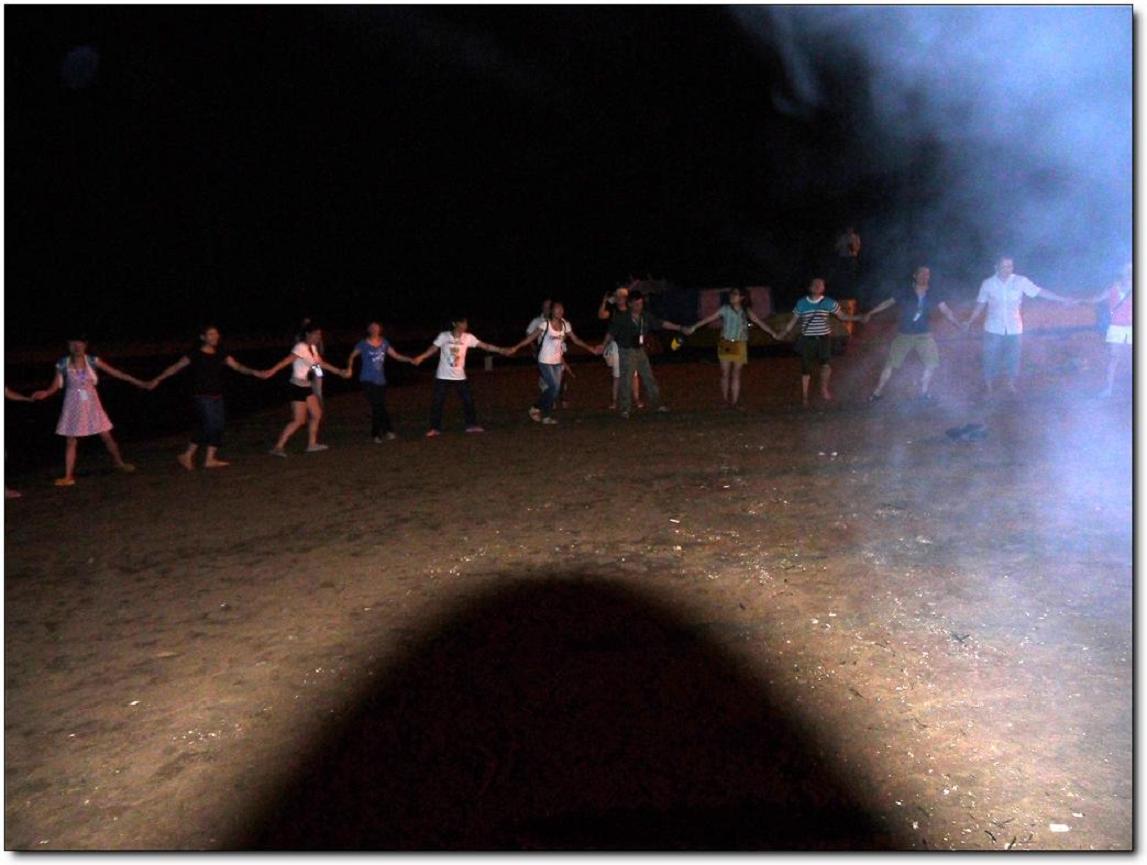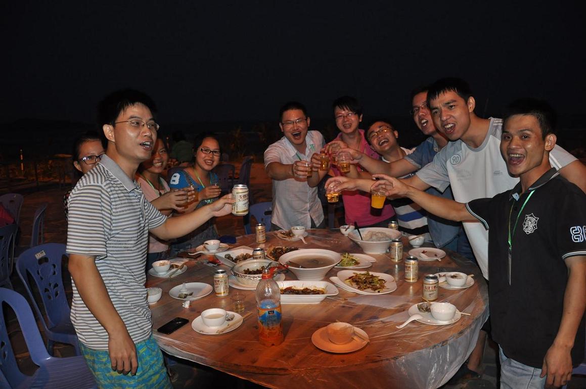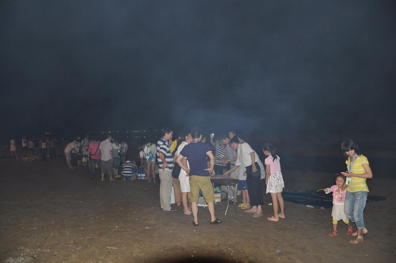 其實真正好玩的應該是晚上吧,一開始是圍著準備著晚餐,吃完以后就是一個似乎沒有什么創(chuàng)意卻讓大家都很開心的節(jié)目---篝火晚會。其實這種大家都圍坐在篝火前玩著簡單但有懲罰的游戲,吃著零食,聊天的感覺還真的是很不錯.雖然會被煙吹的流眼淚,但篝火把每個人的臉都烤的紅紅的,而寒冷的海風也似乎消失了。守夜的篝火已燃到第二把,深夜海上的寒氣催促著我們的臉。躺在黏黏的防潮墊上,聽著海的咆哮,那巨大的聲響好似要把我吞沒。惶恐中那股咸咸的氣味在鼻腔緩緩游蕩,真是別有一番風味。接下來就是燒烤了,有的同事在海邊戲水正酣,有的同事那邊熊熊的燒烤爐已經(jīng)點燃,香滑雞翅、可愛的士豆、清香的玉米、清甜的韭菜、肥肥的茄子,紛紛上陣,哇哇哇、真是讓人忙不過來,不知先吃哪樣才好。但我還得接受炭火的“炙烤”不斷鍛煉自己的燒烤技巧,我們吃著喝著玩著,長大了又何妨?我們的心還年輕著呢!就在這時一片海灘只聽見海浪與我們的歡笑聲。