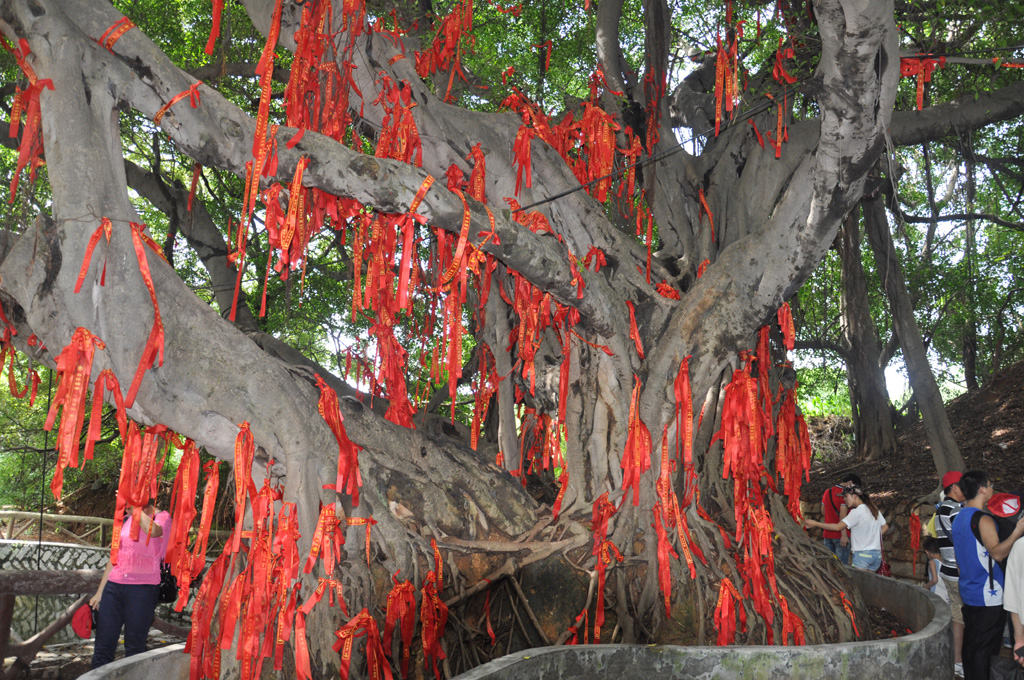 迫不及待的想登上游船前往小嶝島,一覽這距離金門只有1600余米的島嶼。為了防止人員走散或發(fā)生安全問題,旅行社為每一個人都準(zhǔn)備了一頂設(shè)計獨特的旅游帽,我們戴上它,分成幾個小組正式開始旅游。首先,參觀的是小嶝島地底下的縱橫交錯的坑道,一千多米長的秘密坑道橫貫小嶝全島,要想獲得現(xiàn)在如此的平靜與安詳是多么的不容易。接著在導(dǎo)游的陪同下,我們一行來到了英靈殿,參觀了有著六百多年樹齡的“八閩鐵樹王”, 樹干上分出了三支粗大的分枝,彎彎曲曲伸向不同方向,似龍又似鳳,大家認(rèn)真的聽著導(dǎo)游講解著其中的故事。據(jù)說這顆鐵樹每年都開花,吉祥的寓意給當(dāng)?shù)鼐用駧チ讼楹团c寄托,為了留住這美好的瞬間,有人舉起相機(jī)捕捉了這個最美好的風(fēng)景。